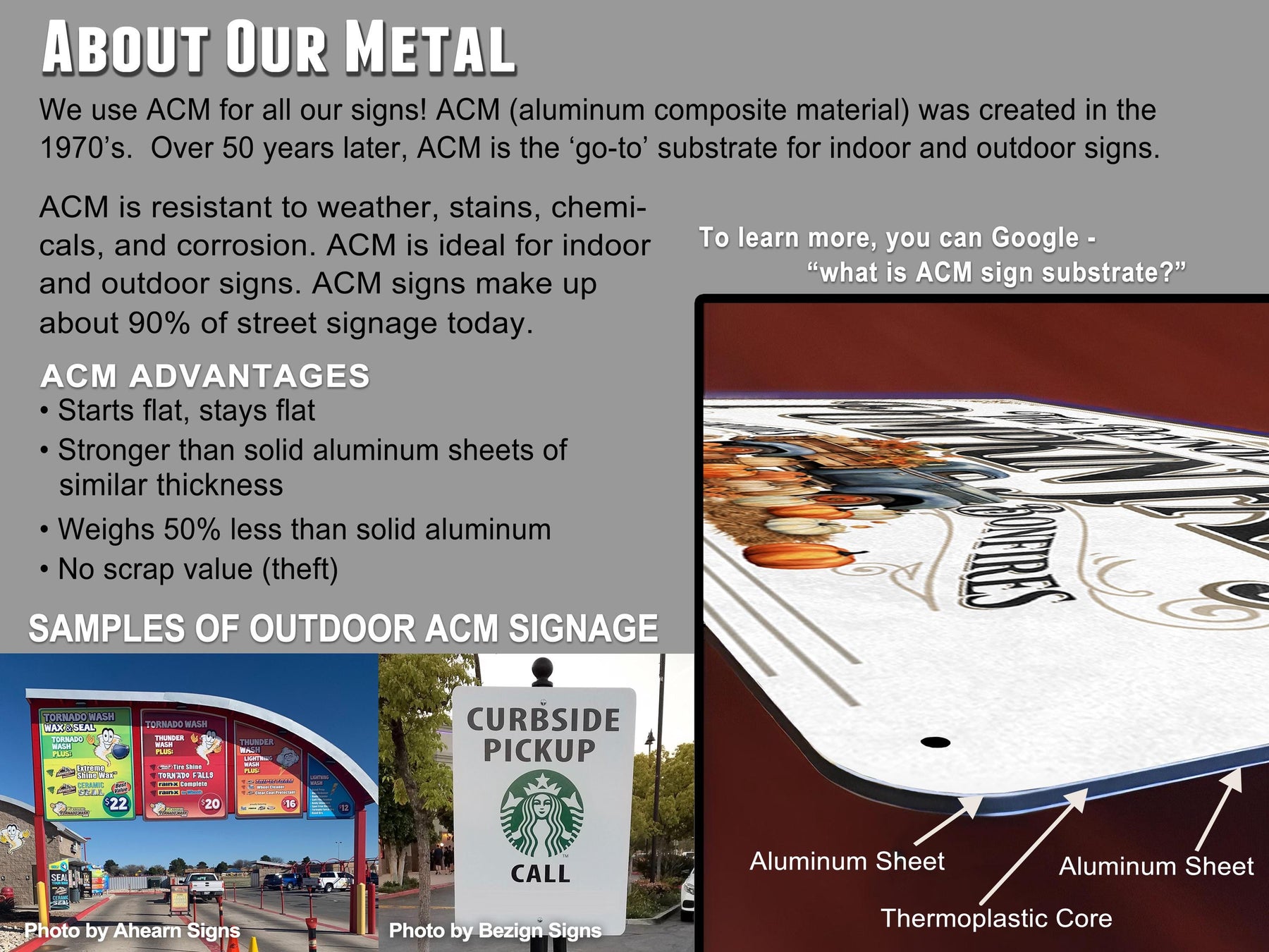 We use ACM for all our signage. ACM is resistant to weather, stains, chemicals, and corrosion. ACM is ideal for indoor or outdoor signage. ACM signs make up about 90% of street signage today.